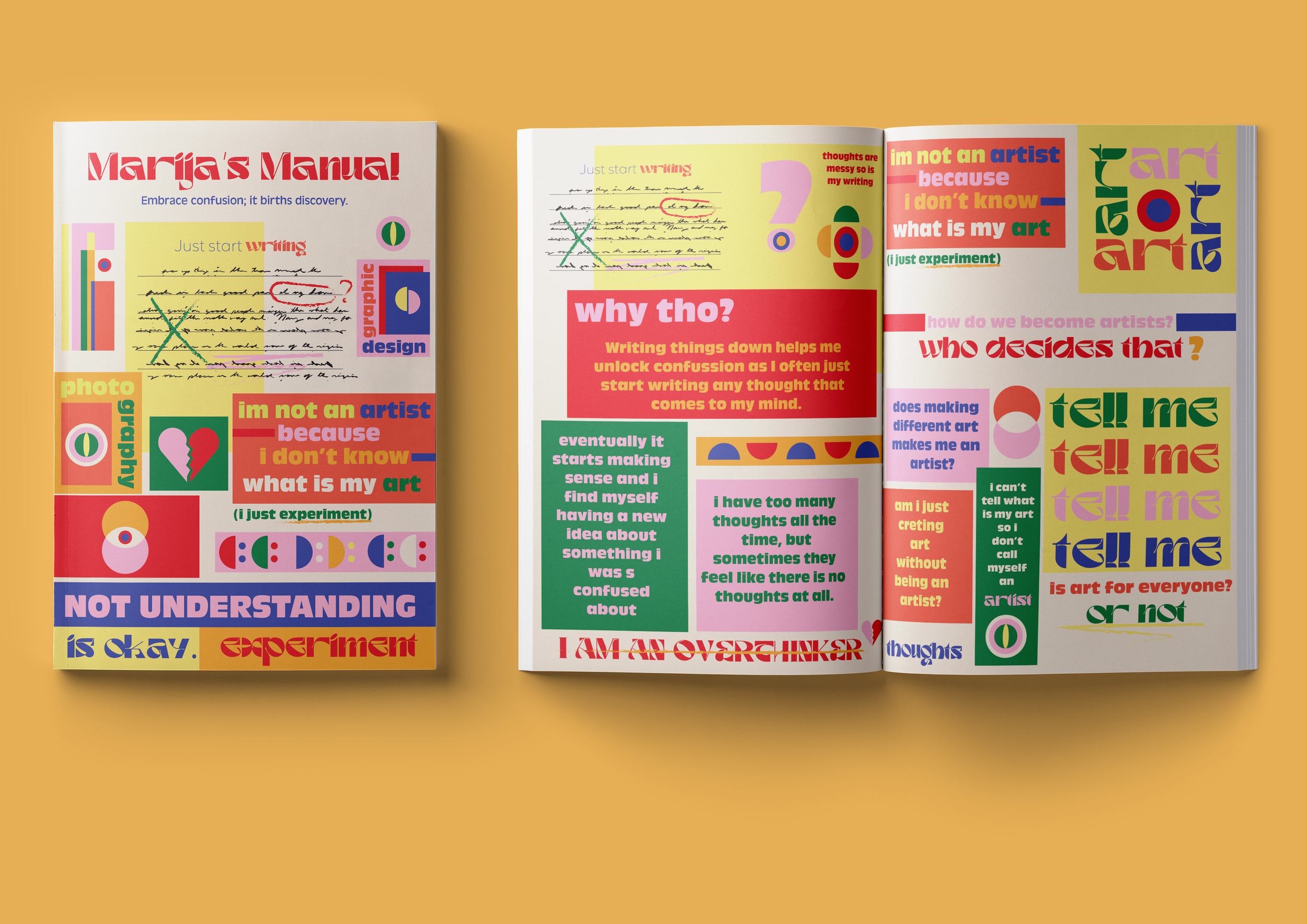 Marija's Manual is a creative booklet that showcases who I am as an artist. I aimed to illustrate the chaotic thoughts that fill my mind, using a blend of words and colors to bring them to life.